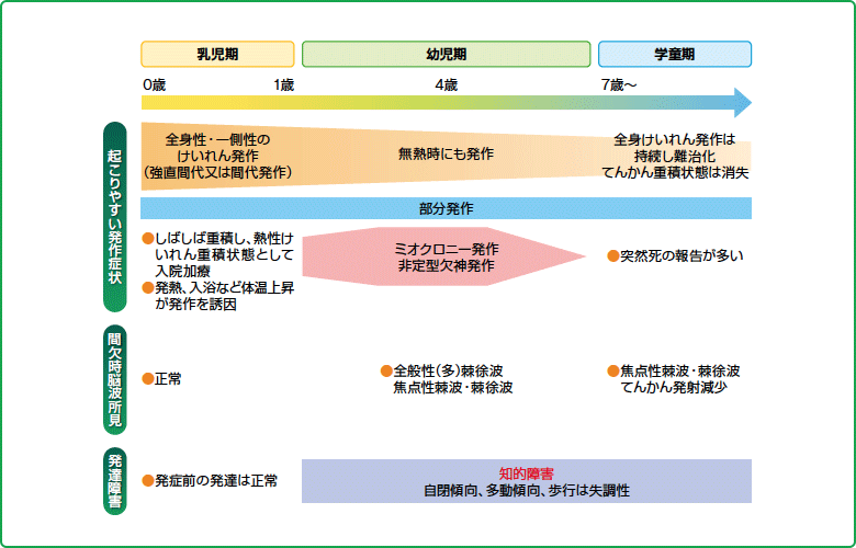 乳児期は、全身性又は一側性の強直間代発作もしくは間代発作で発症します。発症前の発達は正常です。発熱により発作が頻回に誘発されることが特徴的で、しばしば重積し、熱性けいれん重積状態として入院加療されることが多いです。入浴による発作誘発も多くみられます。年齢が上がるとともに、発熱に伴う発作は減少しますが、無熱時の全身けいれん発作は持続します。