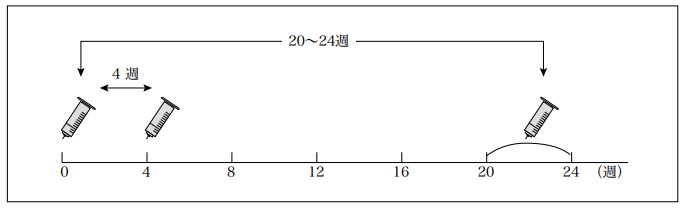 10歳以上の者には1回0.5mL、10歳未満の者には1回0.25mLを4週間隔で2回、さらに1回目の接種から20~24週後に1回の計3回を皮下又は筋肉内に接種します(ただし、10歳未満の者には皮下接種)。