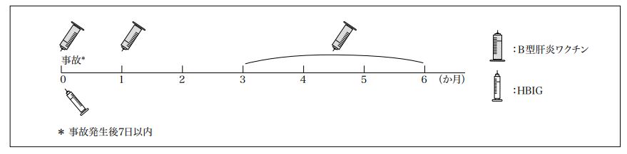 通常、0.5mLを1回、事故発生後7日以内に皮下又は筋肉内に注射する。更に0.5mLずつを初回注射の1箇月後及び3~6箇月後の2回、同様の用法で注射する。なお、10歳未満の者には、0.25mLずつを同様の投与間隔で皮下に注射する。ただし、能動的HBs抗体が獲得されていない場合には追加注射する。