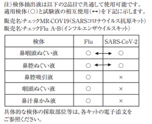 ただし、チェックFluA・BとチェックMR-COV19で共通する適応検体は、鼻咽頭ぬぐい液、鼻腔ぬぐい液のみです。