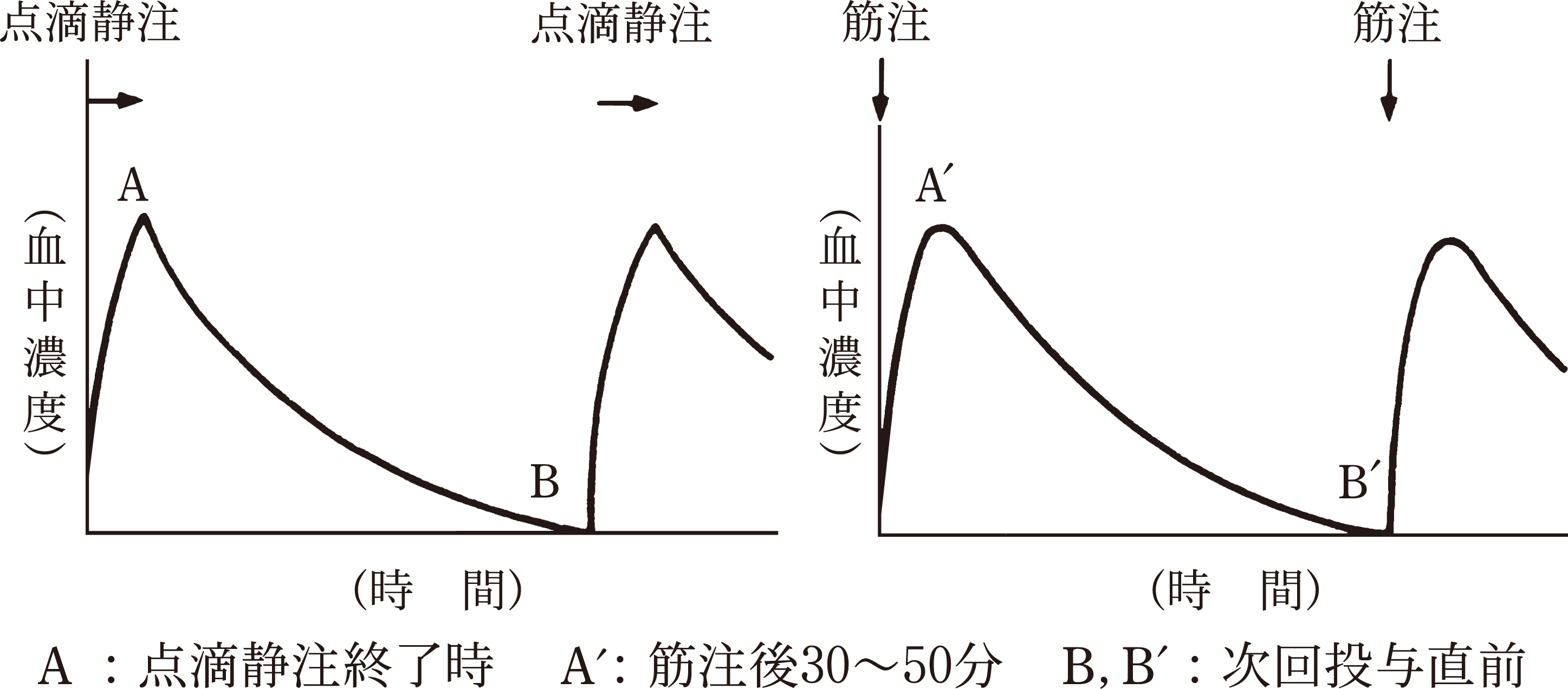 アミノグリコシド系抗生物質による副作用発現の危険性は、最高血中濃度(ピーク値)あるいは最低血中濃度(次回投与直前値)が異常に高い値を繰り返すほど大きくなるといわれており、特に本剤の場合は、最低血中濃度が2μg/mL以上が繰り返されると第8脳神経障害や腎障害発生の危険性が大きくなる可能性がある。また、最高血中濃度は薬効と関係しており、本剤では、その標準的な目安は9~20μg/mLと考えられている。特に新生児、低出生体重児、高齢者及び大量投与患者では適切な間隔で最高血中濃度(A,A′)と最低血中濃度(B,B′)を測定し、異常な高値を示す場合には、次回投与より投与量や投与間隔を調整することが望ましい。例えば、異常に高い最高血中濃度が繰り返されている場合は投与量を減量し、異常に高い最低血中濃度が繰り返されている場合は投与間隔を延長するなど調整を行う。[8.3、9.7.2、9.7.3、9.8参照]