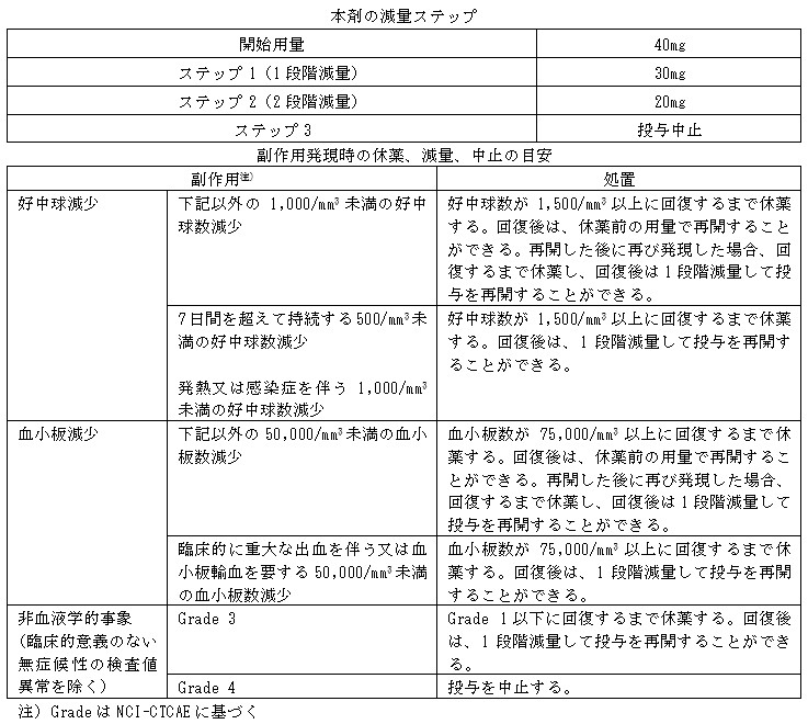 7.2 本剤の投与により副作用が発現した場合には、以下の基準を参考に、本剤を休薬、減量又は中止すること。[8.1 参照],[9.1.1 参照]