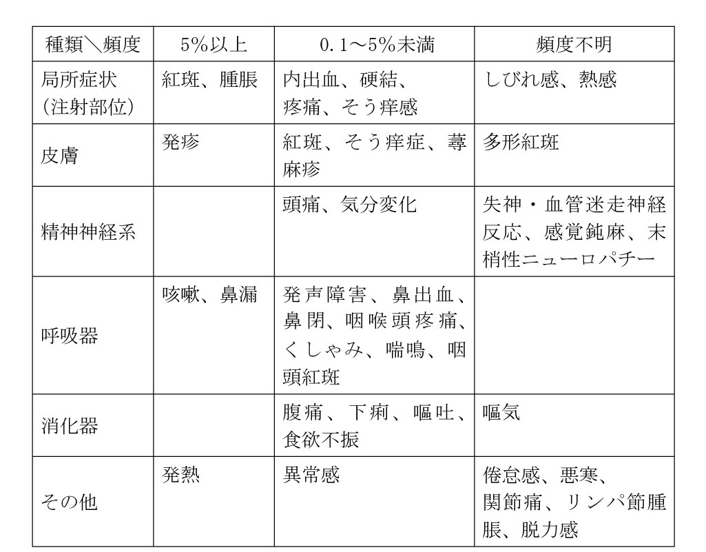 通常、接種後数日から3週ごろに紫斑、鼻出血、口腔粘膜出血等があらわれる。本症が疑われる場合には、血液検査等を実施し、適切な処置を行うこと。