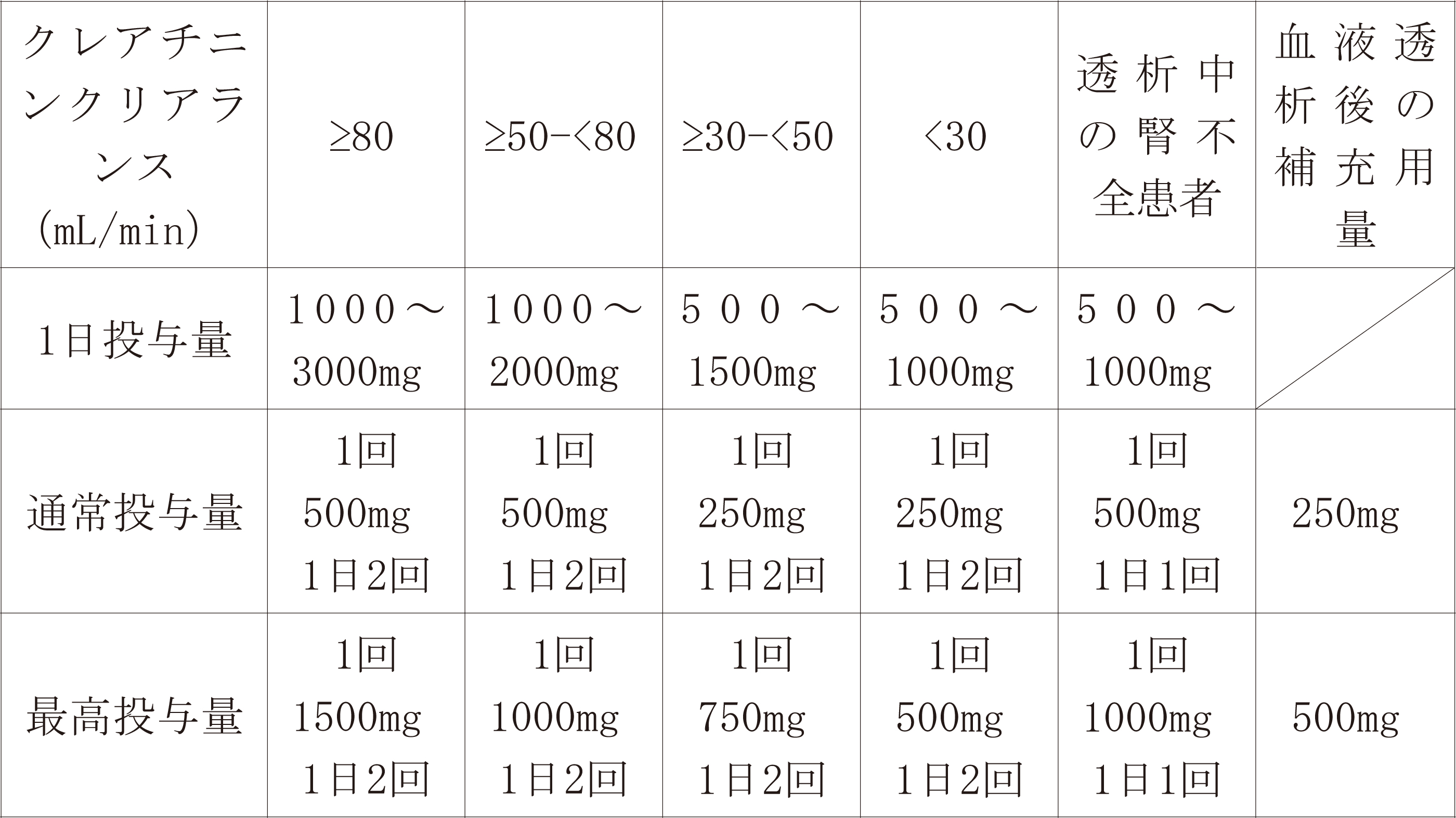 7.2 腎機能障害を有する成人患者に本剤を投与する場合は、下表に示すクレアチニンクリアランス値を参考として本剤の投与量及び投与間隔を調節すること。また、血液透析を受けている成人患者では、クレアチニンクリアランス値に応じた1日用量に加えて、血液透析を実施した後に本剤の追加投与を行うこと。なお、ここで示している用法及び用量はシミュレーション結果に基づくものであることから、患者ごとに慎重に観察しながら、用法及び用量を調節すること。また、腎機能障害を有する小児患者についても腎機能の程度に応じて、本剤の投与量及び投与間隔を調節するなど慎重に投与すること。[9.2.1 参照],[9.2.2 参照],[9.8 参照],[16.6.1 参照],[16.6.2 参照]