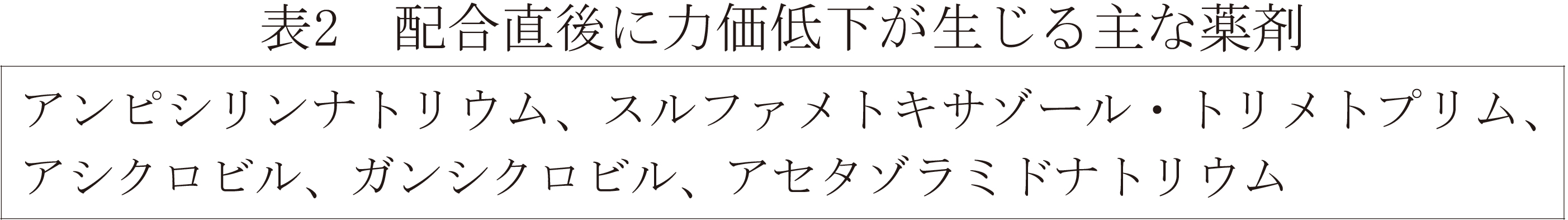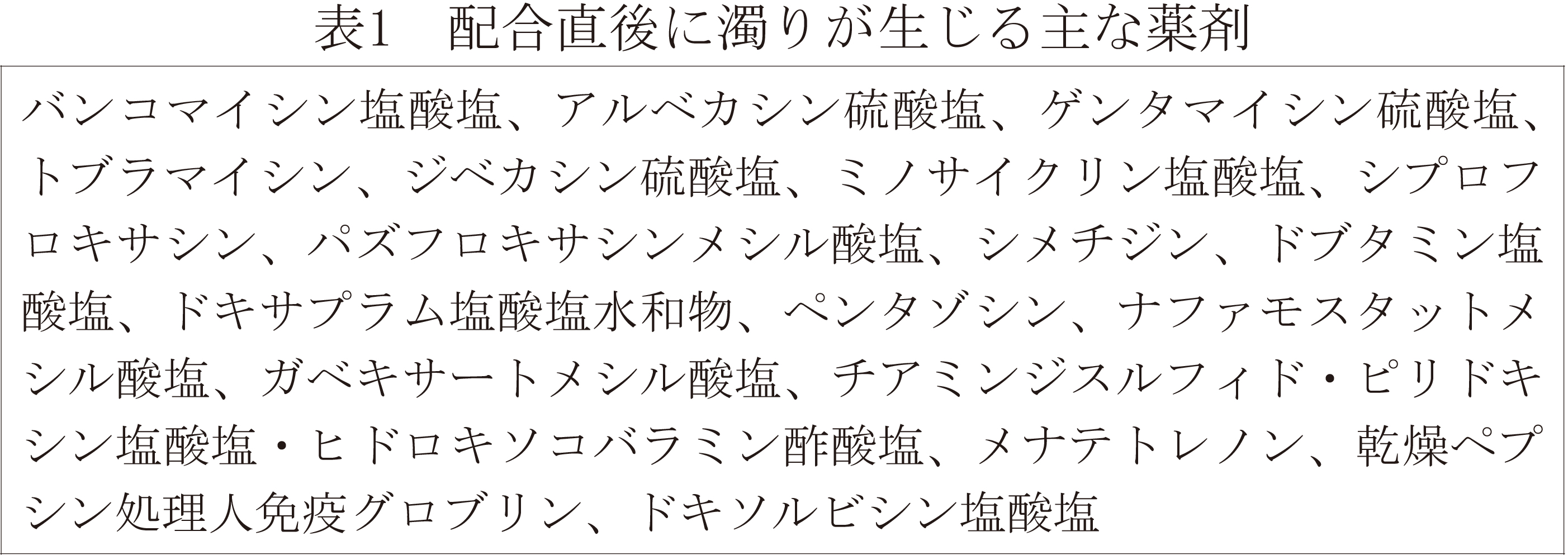 本剤は他剤と配合したとき、濁りが生じることがある。また、本剤は塩基性溶液中で不安定であるため、力価の低下が生じることがある。表1に配合直後に濁りが生じる主な薬剤を、表2に配合直後に力価低下が生じる主な薬剤を示す。