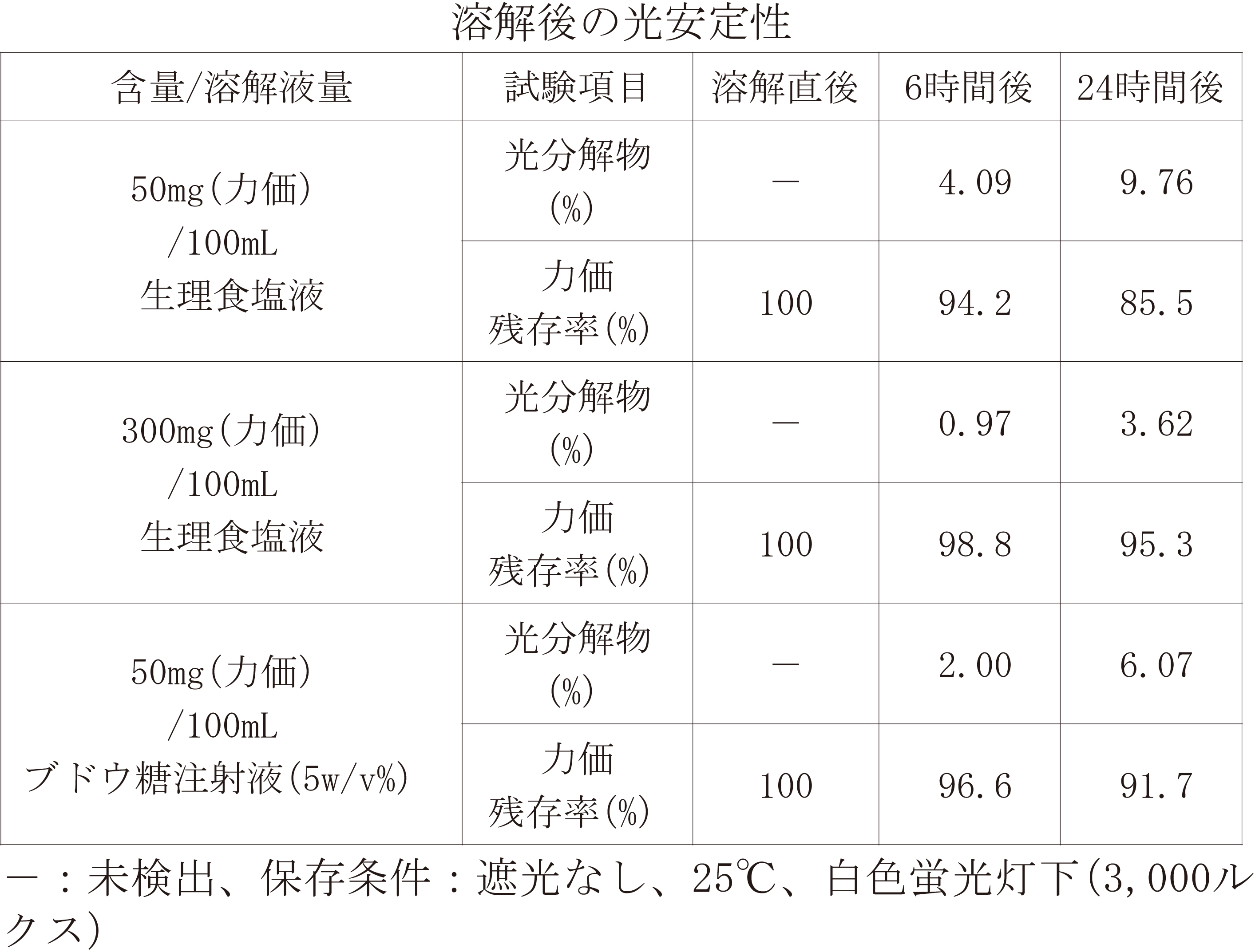 光により徐々に分解するので直射日光を避けて使用すること。また、調製後、点滴終了までに6時間を超える場合には点滴容器を遮光すること。点滴チューブを遮光する必要はない。