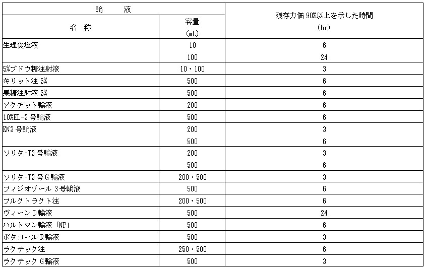 0.5gバイアル製剤を、25±2℃で主な輸液に溶解したとき、本剤の残存力価が90%以上を示した時間は下表のとおりである。[14.1.2 参照]