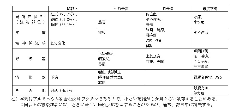 接種後数日から3週ごろに紫斑、鼻出血、口腔粘膜出血等があらわれることがある。本症が疑われる場合には、血液検査等を実施し、適切な処置を行うこと。