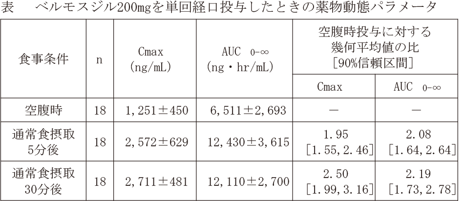 日本人健康成人男性(18例)を対象とした食事の影響試験において、通常食摂取5分後又は30分後に単回経口投与したときのCmax及びAUC0-∞は、空腹時に投与したときに比べ約2倍であった。通常食摂取30分後に単回投与したときのCmax及びAUC0-∞は、通常食摂取5分後に比べ、Cmaxは1.28倍であったが、AUC0-∞は1.05倍であり大きな差はなかった。食事の種類(高脂肪食又は通常食)によっても、薬物動態に大きな差はなかった。[7.1参照]