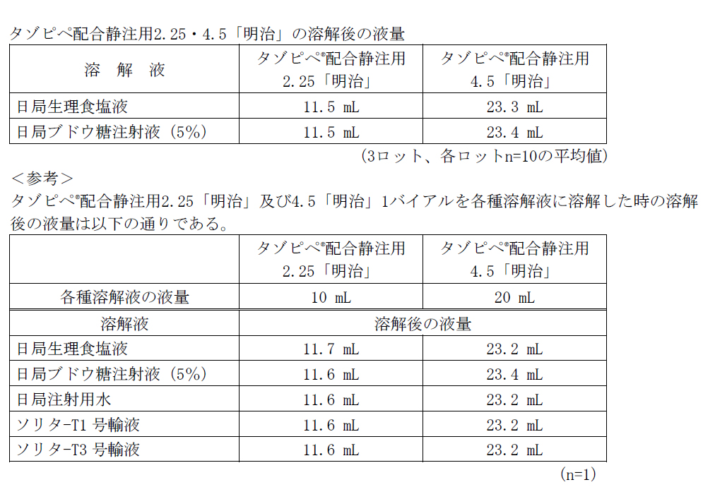 本剤2.25gバイアルにおいて、1バイアルを生理食塩液及び5%ブドウ糖注射液10mLに溶解した時の溶解後の液量は、いずれも11.5mL(196mg(力価)/mL)となる。また、本剤4.5gバイアルにおいて、1バイアルを生理食塩液及び5%ブドウ糖注射液20mLに溶解した時の溶解後の液量は、それぞれ23.3及び23.4mL(193及び192mg(力価)/mL)となる。