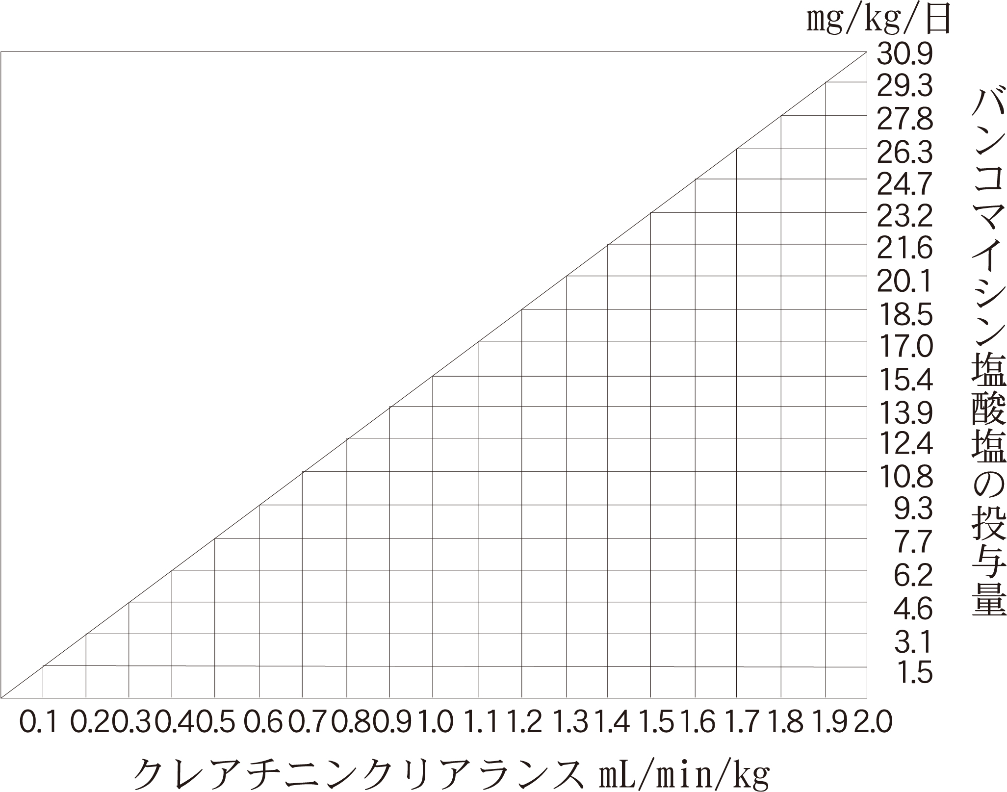 7.2 腎機能障害患者では健康者より血中濃度の半減期が延長するので、投与量を修正して使用する必要がある。クレアチニンクリアランスから投与量を修正する目安は下図により算出できる(外国人データ)。[9.2、16.6.1参照]