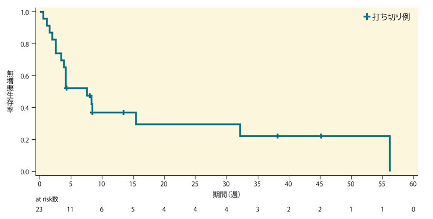 副次評価項目であるPFSは下図の通りで、データカットオフ時点で23例中17例(73.9%)にPDが確認され、6例が打ち切り*であった。PFSの中央値は、7.6週(95%CI:3.4, 32.1)[1.7ヵ月(95%CI:0.8, 7.4)]であった。