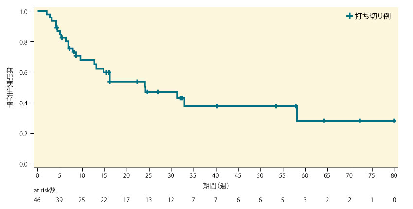 主要評価項目であるPPSのORRは45.7%(21/46例、95%C:I 30.9, 61.0)であり、本試験の目標である30%を超え、95%CIの下限が本試験で規定した10%の閾値を上回っていた。