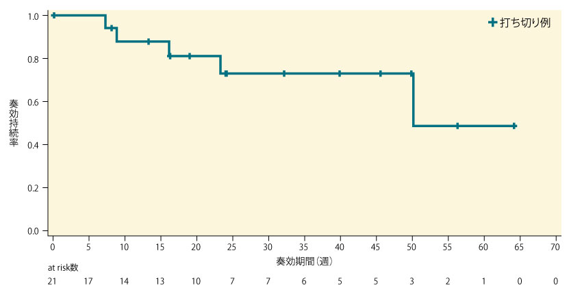 探索的評価項目であるTTRの中央値は、奏効が認められた21例において8.1週(95%CI:8.0, 8.4)であった。
