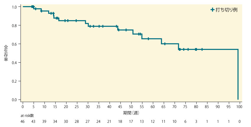 探索的評価項目であるOSは下図の通りで、データカットオフ日までに、46例中14例(30.4%)の死亡が報告された。OSの中央値は、99.1週(95%CI:54.9, -)[22.8ヵ月(95%CI:12.6, -)]であった。