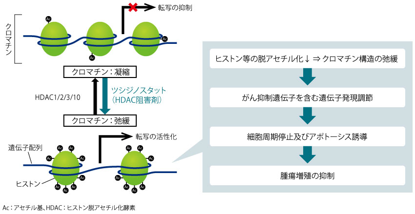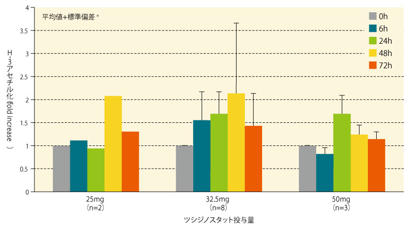 ヒト子宮頸部腺がんHeLa細胞及びヒト末梢血単核細胞を用いて、ツシジノスタットによるH-3アセチル化について検討したところ、いずれの細胞においても、ツシジノスタットによるアセチル化への誘導が示された(a、b)。 また、H-3アセチル化は、処理後0.5~1時間の時点で認められ、24~72時間で最大に達した(c)。