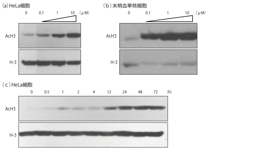 (a)HeLa細胞を溶媒又はツシジノスタット0.1、1、10μMとともに24時間、(b)健常人から採取したヒト末梢血単核細胞を溶媒又はツシジノスタット0.1、1、10μMとともに24時間、(c)HeLa細胞をツシジノスタット1μMとともに0~72時間インキュベートした後、各細胞溶解物からヒストンを単離し、H-3アセチル化の状態を抗アセチル化H-3(AcH3)抗体及び再プローブした抗H-3抗体を用いたウェスタン免疫ブロット法により解析した。