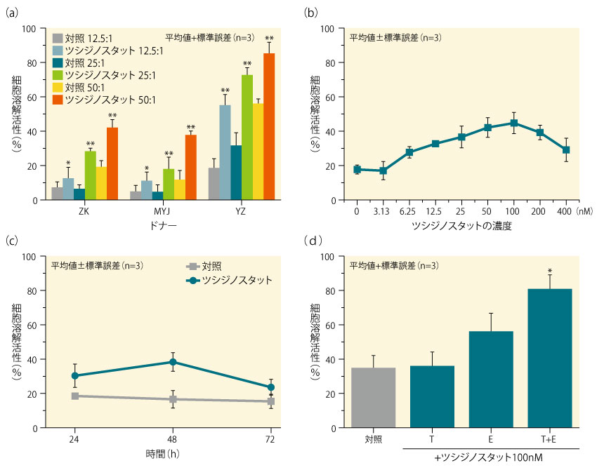 健常ドナーからの末梢血単核細胞を用いて、免疫系を介したツシジノスタットの抗腫瘍効果の潜在能力を検討した。ツシジノスタットによるナチュラルキラー(NK)細胞を介した細胞傷害性評価での標的細胞であるK562細胞の溶解作用は有意に高まり(a)、最大の標的細胞溶解活性はツシジノスタット100nMの添加時に認められ(b)、この濃度では48時間が最適培養時間であった(c)。K562細胞(標的細胞)のみにツシジノスタットを添加して培養したとき、ツシジノスタットを添加しなかった末梢血単核細胞(エフェクター細胞)の共存下で細胞溶解性は促進されなかったが、標的細胞及びエフェクター細胞の双方にツシジノスタットを添加したときには、エフェクター細胞のみに添加した場合と比較して細胞溶解性は有意に高まった(d)。