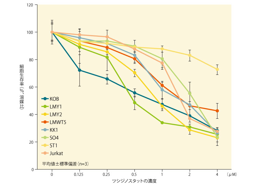 7種の初代ATL由来細胞株及びJurkat細胞を溶媒又はツシジノスタット0.125~4μMで処理し、処理後72時間の細胞生存率(溶媒と比較)について、MTSアッセイ[5(- 3-カルボメトキシフェニル)-2(- 4,5-ジメチル-チアゾイル)-3-(4-スルフォフェニル)テトラゾリウムアッセイ]を用いて評価した。なお、Jurkat及びST1以外にはIL-2を添加した。
