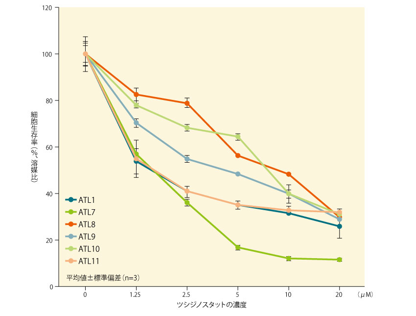 ATL患者10例から採取した11種の初代ATL細胞のうち、再発2例(ATL1及びATL10)、及び予後不良因子を有する慢性型2例(ATL7及びATL8)を含む6種の初代ATL細胞を用いて、ATL細胞におけるツシジノスタットの活性を検討したところ、すべての細胞において用量依存的な生存能力の低下が示された。