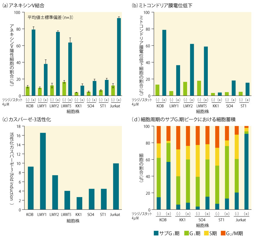 7種の初代ATL由来細胞株(KOB、LMY1、LMY2、LMWT5、KK1、SO4及びST1)、及びヒト急性T細胞白血病由来Jurkat株における、ツシジノスタットによるアポトーシスの誘導について、4つのアッセイを用いて評価した。 その結果、(a)アネキシンV結合、(b)ミトコンドリア膜電位低下、(c)カスパーゼ-3活性化のいずれにおいても、KOB、LMY1、LMY2、LMWT5及びJurkatで、ツシジノスタットによるアポトーシスの誘導が示された。 また、(d)細胞周期においては、KK1、SO4及びST1で、ツシジノスタットによるG1期での細胞周期停止の誘導が認められた。