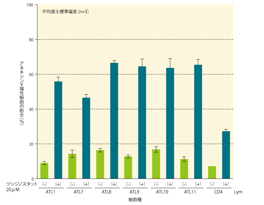 ATL患者10例から採取した11種の初代ATL細胞のうち、再発2例(ATL1及びATL10)、及び予後不良因子を有する慢性型2例(ATL7及びATL8)を含む6種の初代ATL細胞における、ツシジノスタットによるアポトーシスの誘導について、アネキシンV/ヨウ化プロピジウムアッセイを用いて評価した。 すべてのATL細胞において、アネキシンV陽性細胞の割合が50%超であったことから、ツシジノスタットは初代ATL細胞においてアポトーシスによる細胞死を誘導したことが示された。なお、対照であるCD4陽性細胞におけるアネキシンV陽性細胞の割合は30%未満であった。