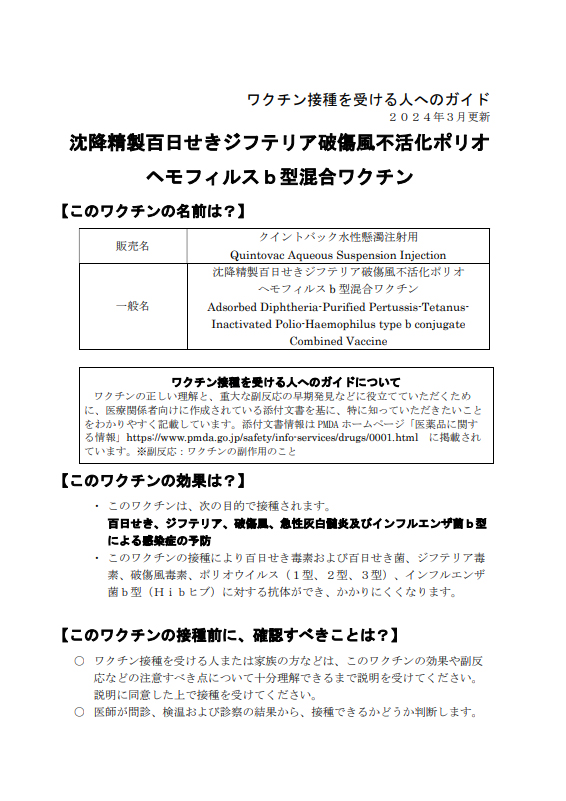クイントバック水性懸濁注射用(沈降精製百日せきジフテリア破傷風不活化ポリオヘモフィルスb型混合ワクチン)