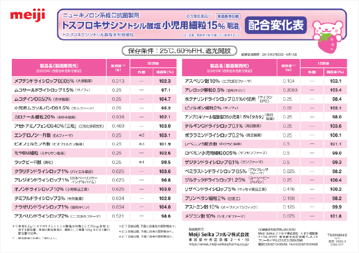 トスフロキサシントシル酸塩小児用細粒15%「明治」(旧処方製剤)配合変化表です。