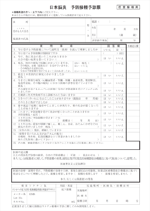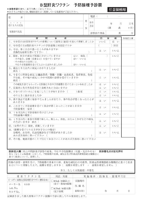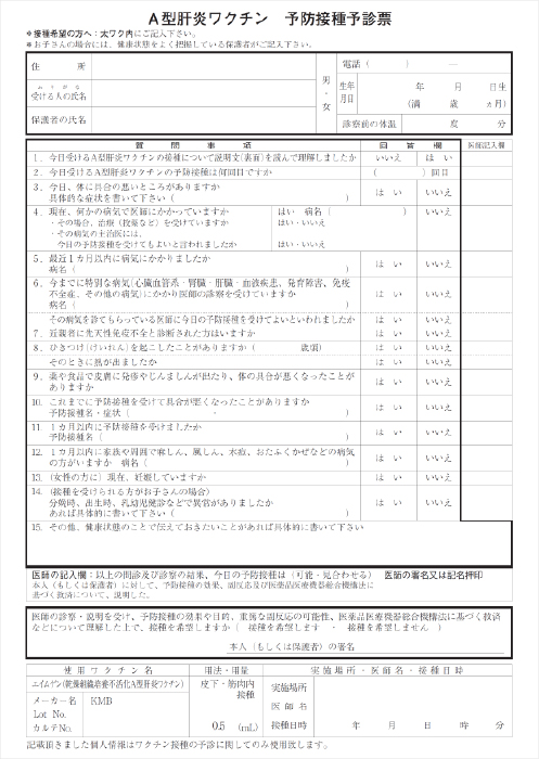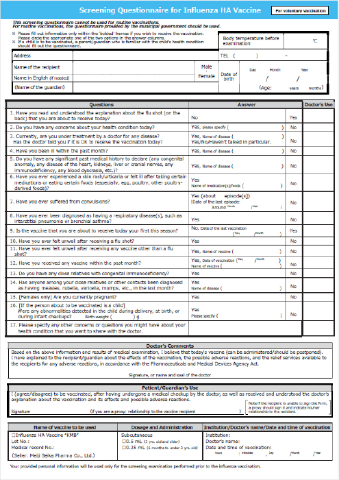 インフルエンザHAワクチン 予防接種予診票 英語版