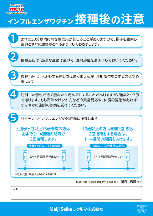 インフルエンザの予防接種を受けた後の注意事項を記載しています。(※担当MRにお問い合わせください)