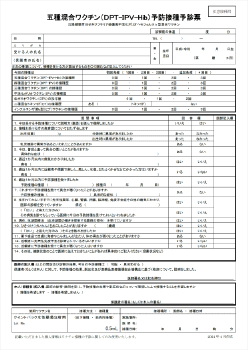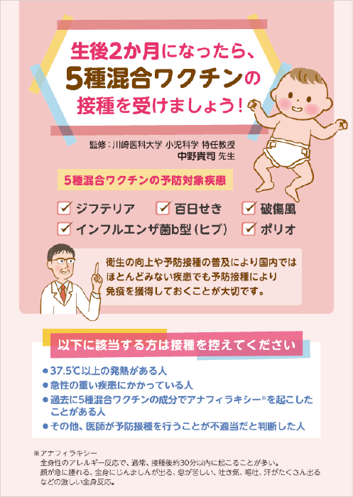 5種混合ワクチンの疾患解説とワクチン接種後の注意を記載した患者指導箋です。